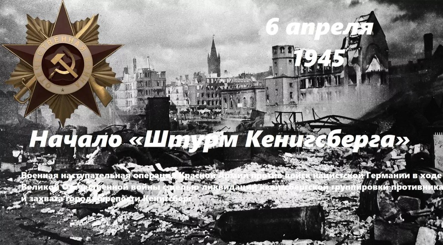 1945 год — начался штурм Кенигсберга (сейчас — Калининград). Войска Красной Армии провели наступательную операцию по прорыву Кенигсбергского укреплённого района и штурму города и крепости. Операция заняла четыре дня, в ходе неё гитлеровская армия потеряла свыше 40 тыс. человек, ещё 90 тыс. нацистов сдались в плен.